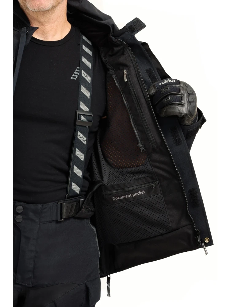 Bezpieczeństwo użytkownika zapewniają certyfikowane protektory Rukka D3O® Air XTR poziomu 2 umieszczone na ramionach, łokciach i plecach, a także podwójny ochraniacz klatki piersiowej D3O® CP2, gwarantujący najwyższy standard ochrony w newralgicznych strefach ciała.