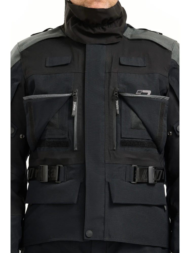 Liczne wodoodporne kieszenie, w tym praktyczna wewnętrzna kieszeń na dokumenty oraz niewielka kieszonka na lewym przedramieniu, umożliwiają bezpieczne przechowywanie najważniejszych przedmiotów podczas jazdy.